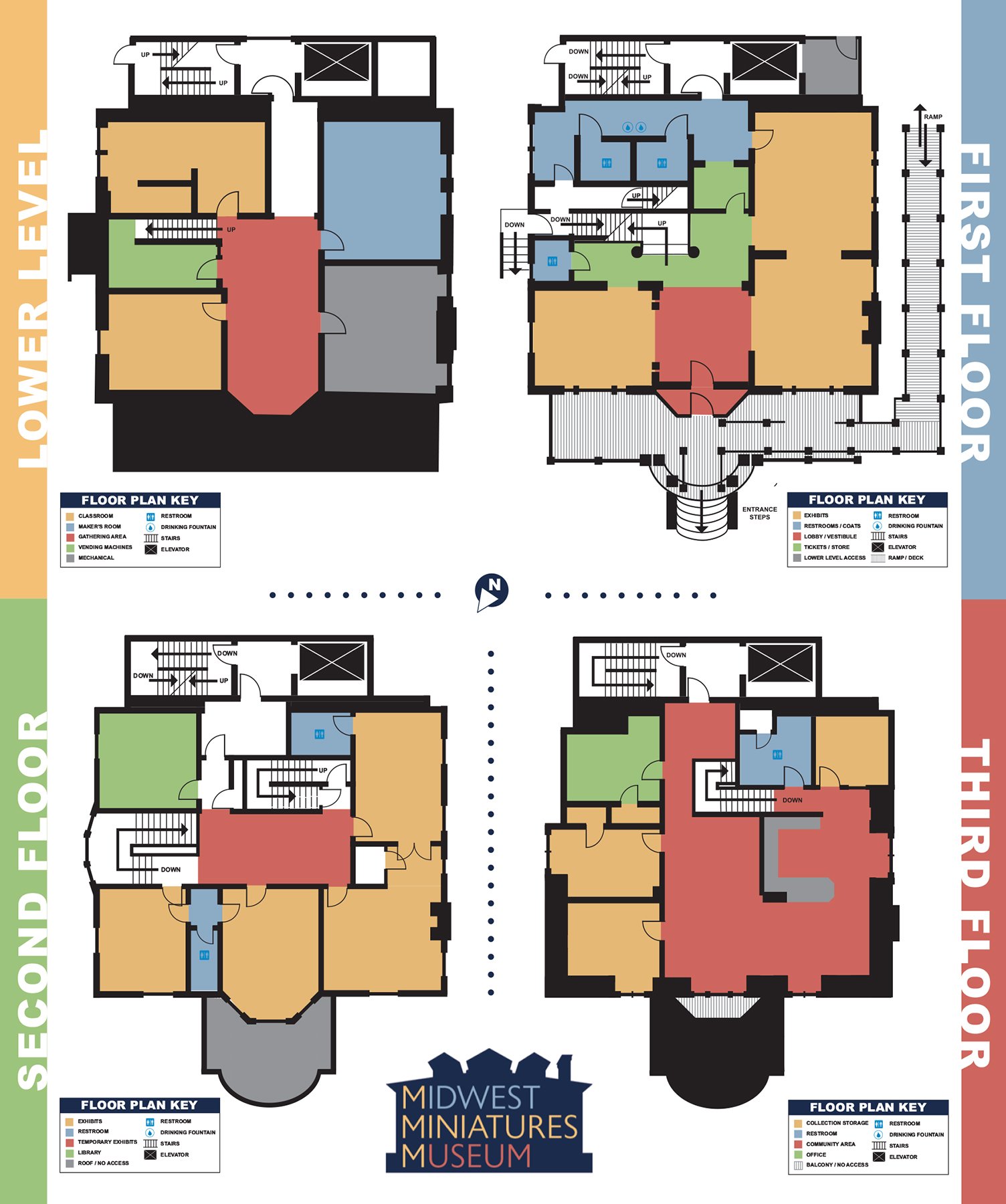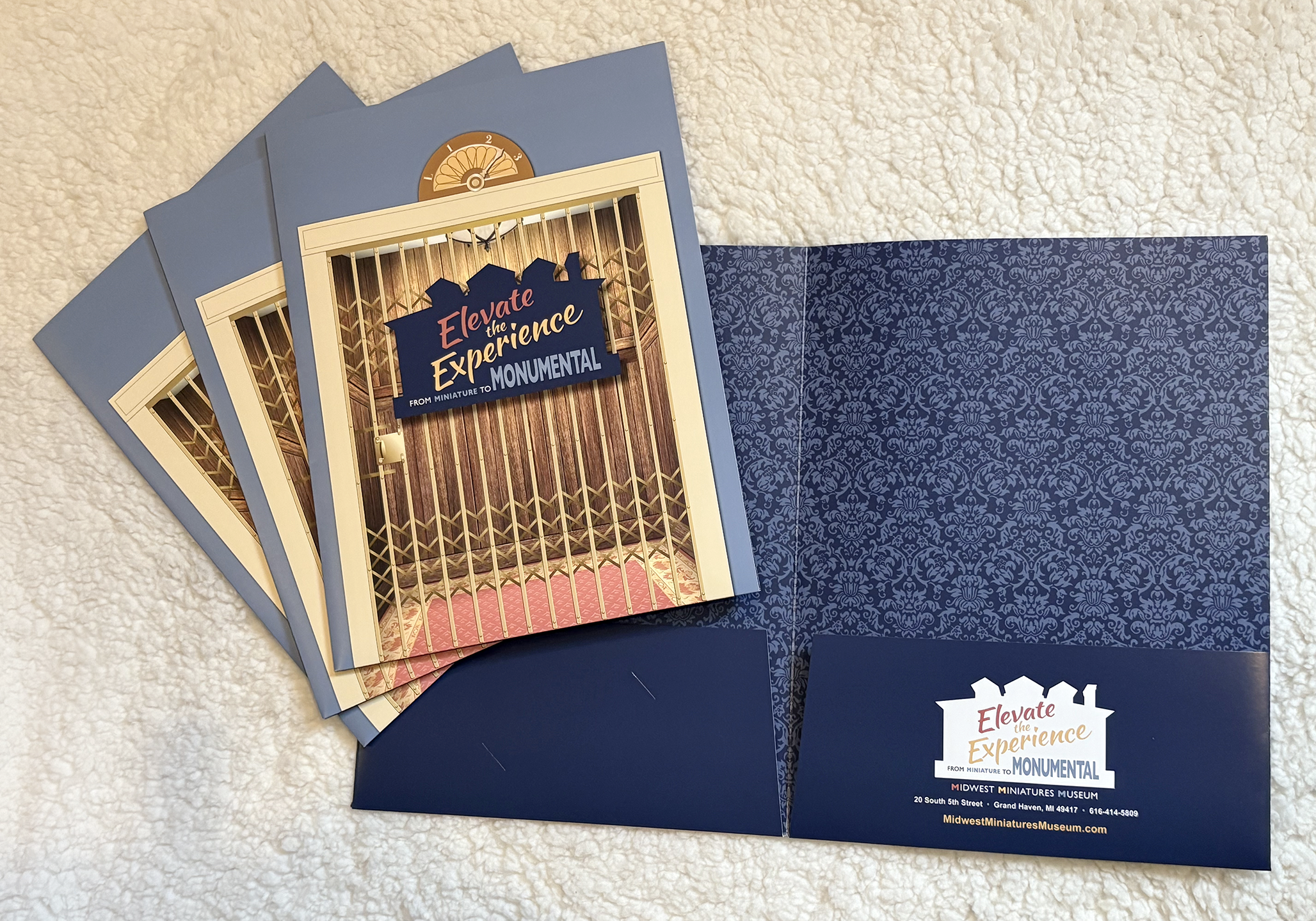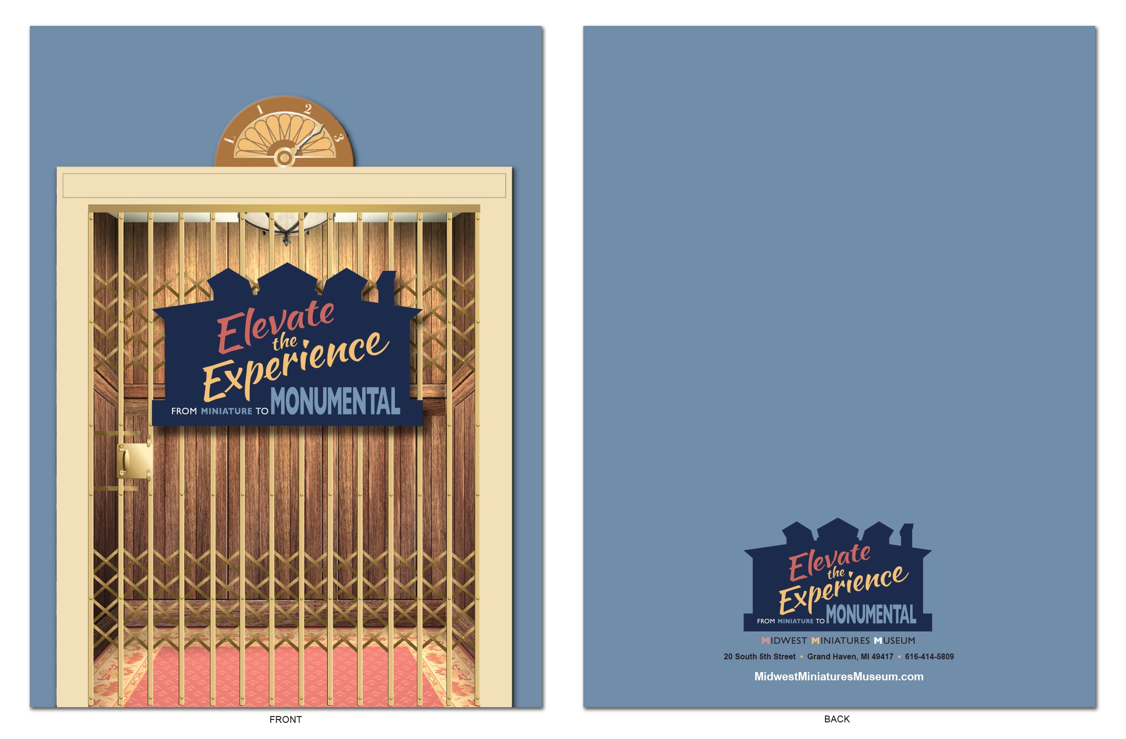 Pictured above are materials from Midwest Miniatures Museum including an advancement campaign folder, a wall mounted map of the museum and rack card. The floor plans for the museum depicted on the wall mounted display were drawn by me using the vector-based program, Illustrator. The advancement campaign’s launch was to help the museum reach it’s financial goal of being able to expand the museum to give the public access to the second floor of the building with the addition of a much needed elevator in their historic location. I created the logo for that campaign as well as the printed materials including the presentation folder depicted above.
